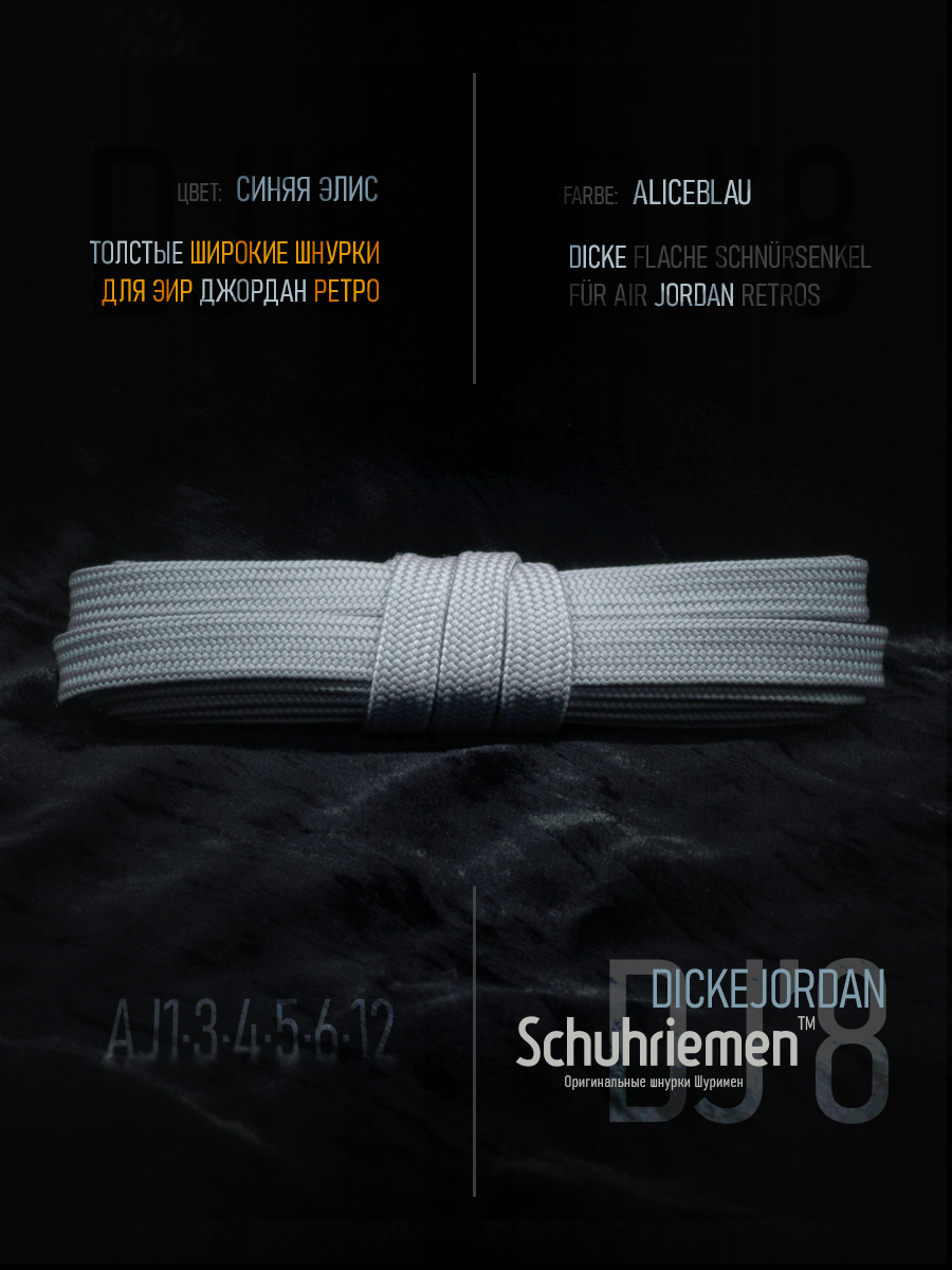 DJordan'8 by Schuhriemen — это широкие плоские шнурки, максимально близкие к оригинальным комплектным шнуркам Air Jordan ретро-эпохи. Та самая «пухлая» текстура, матовый благородный блеск, плотность, которую чувствуешь ещё до того, как завязал узел.