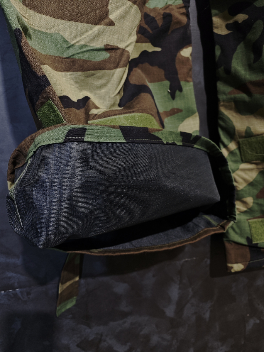 Состоят из двух основных слоёв: Внешняя оболочка (Outer shell): Изготовлена из смесовой ткани 50% нейлон / 50% хлопок в расцветке Woodland (M81). Данный материал обеспечивает механическую прочность, износостойкость и огнезащитные свойства (NFR). Внутренний слой (Liner): Специальный материал - углеволокно. На бирке указано: "JLIST Approved Material", что подтверждает соответствие стандартам комплекта JSLIST.