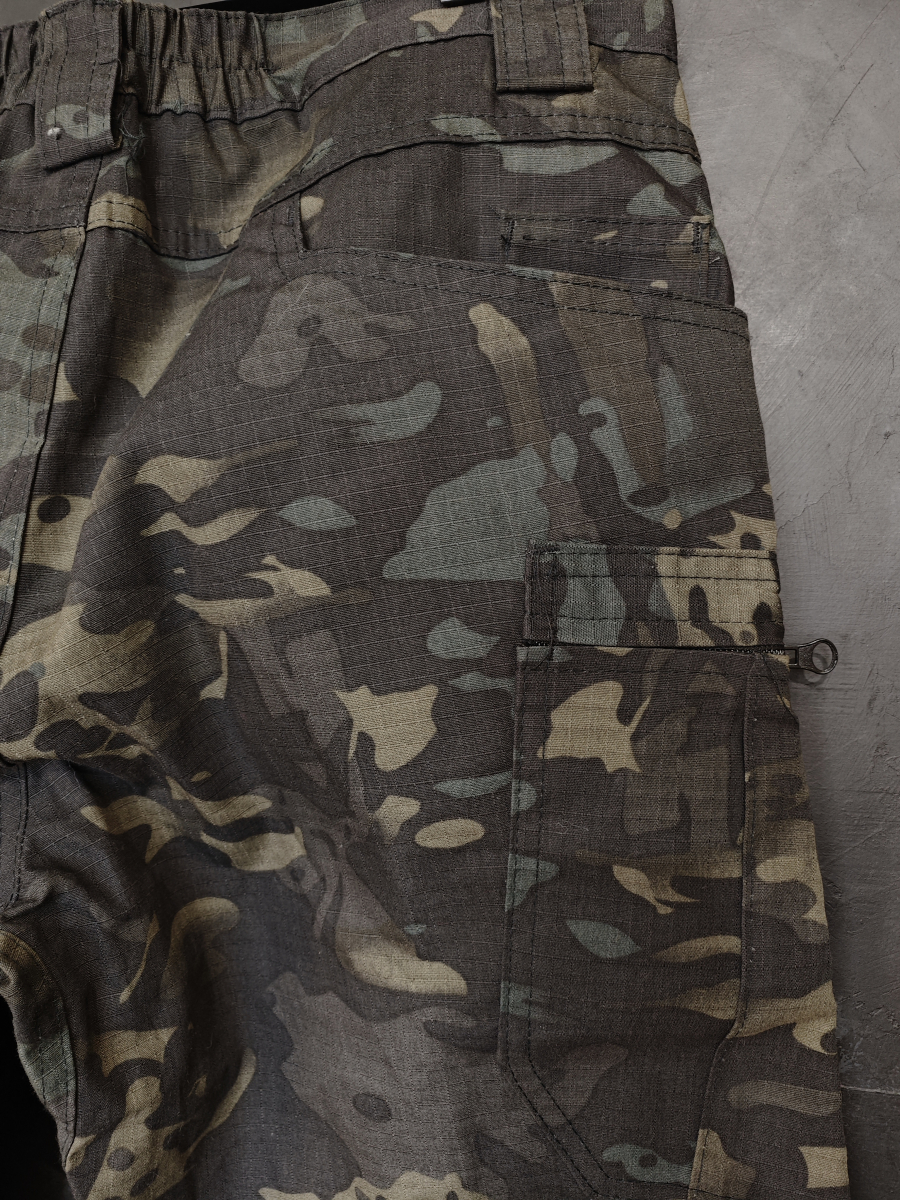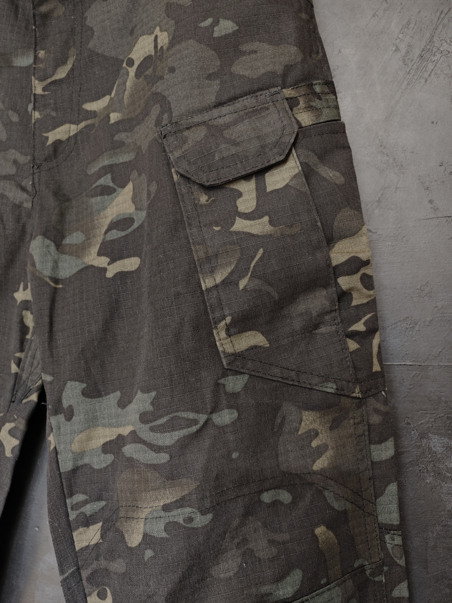 Брюки в темном камуфляже мультикам, из ткани рип- стоп.