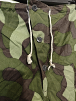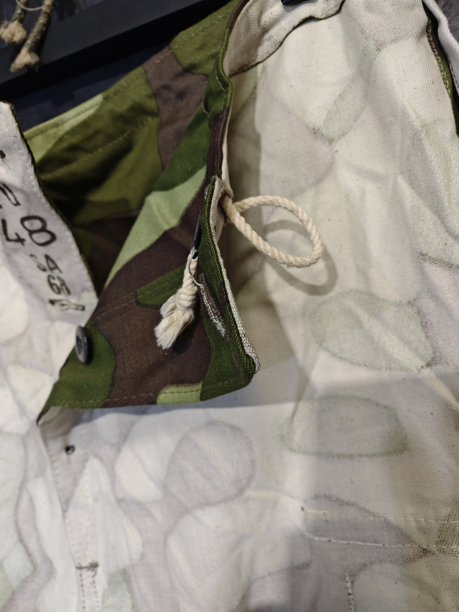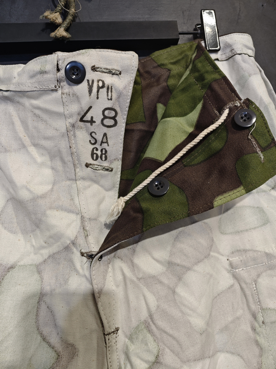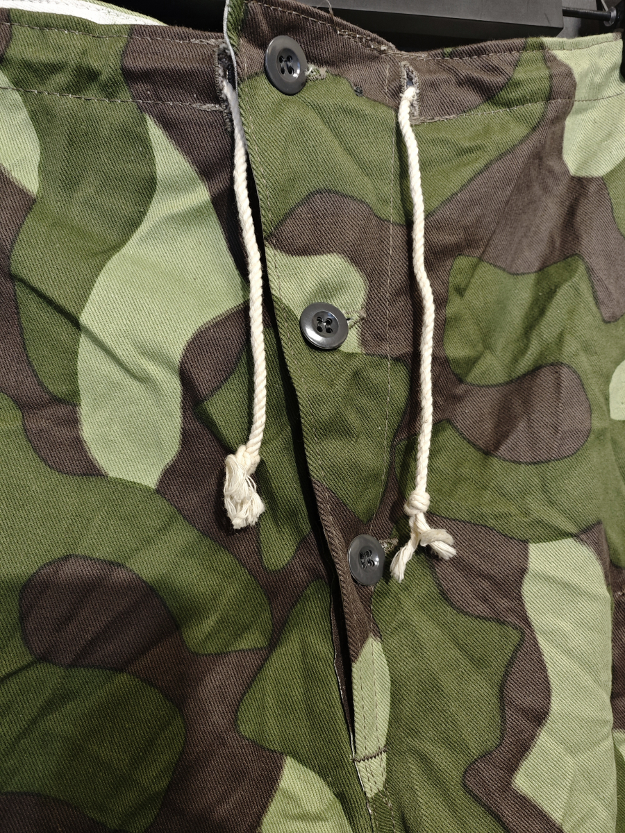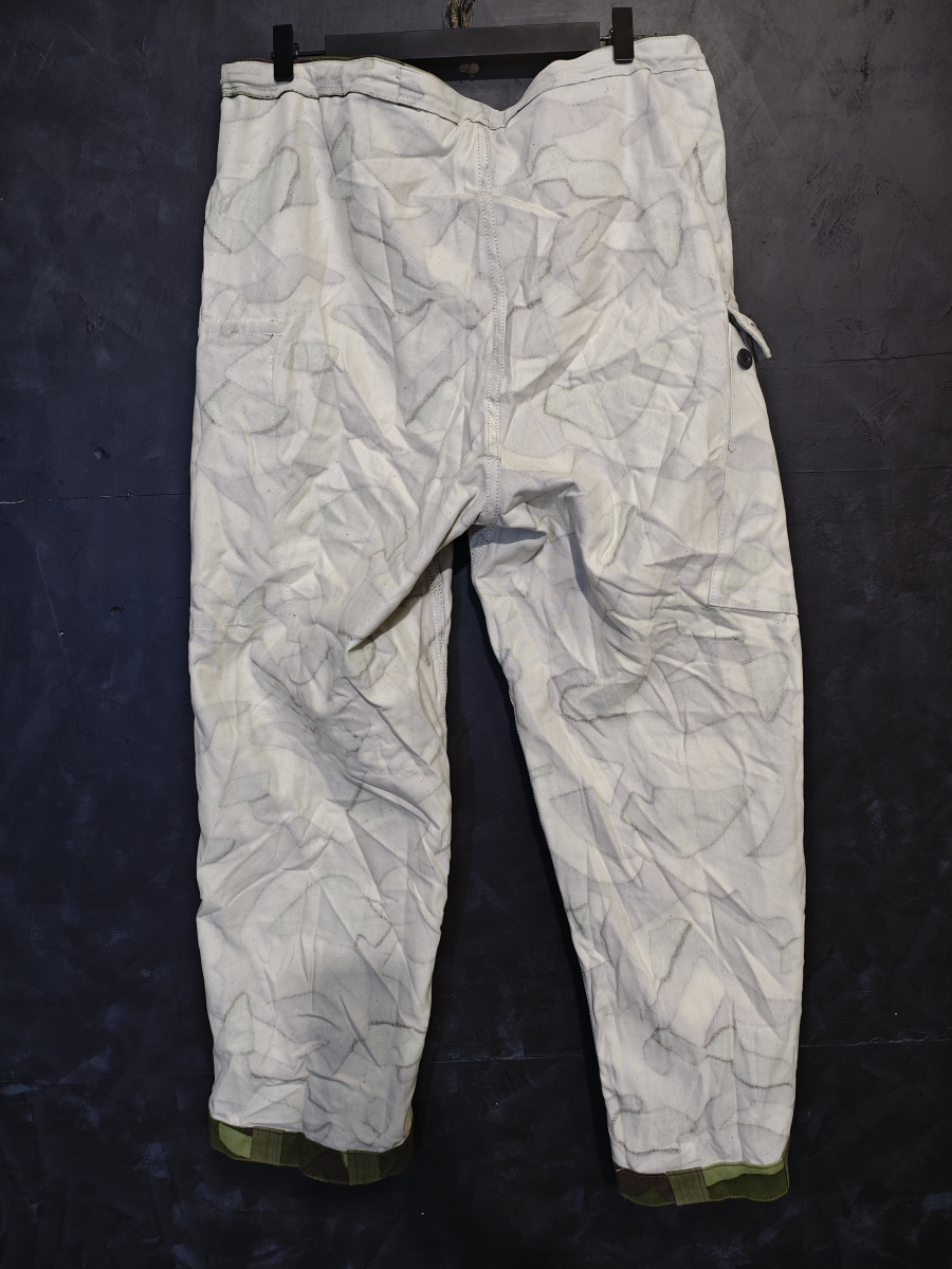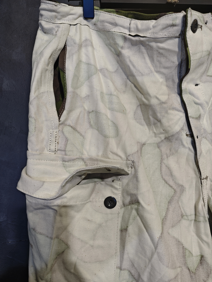 Уникальная особенность этих брюк в том, что они двусторонние. С одной стороны лесной камуфляж, а с другой равномерный белый цвет. На обеих сторонах есть карманы и пуговицы. Экономные фины подразумевали, что костюм будет использоваться и летом и зимой.