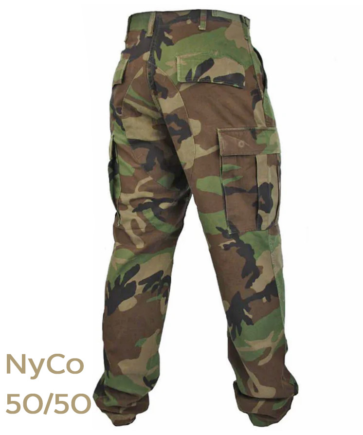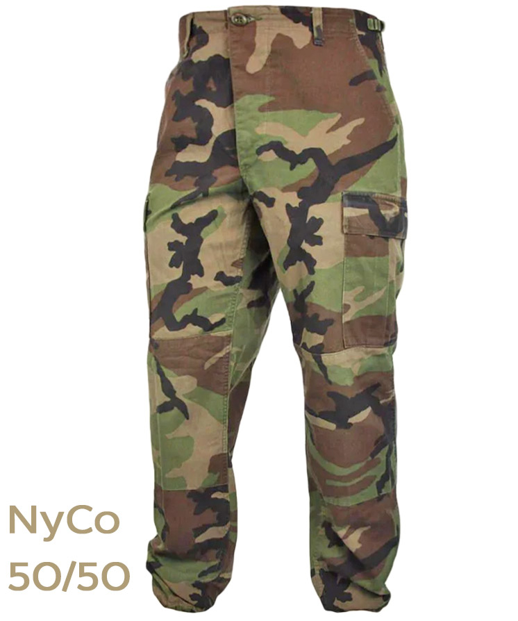 Форма USGI Type I BDU, лесной камуфляж Woodland изготавливались из прочного твила NYCO 50/50 (нейлон/хлопок). Эти брюки стали частью униформы для умеренной погоды параллельно с выпуском униформы для жаркой погоды Типа III (100% хлопок). Брюки имеют шесть карманов, расположение которых одинаково для всех типов униформ BDU и DBDU. Имеются два косых кармана и задние карманы с клапанами на пуговицах. На каждой ноге также имеется грузовой карман с клапаном на пуговицах. На талии имеются регулировочные ремни для лучшей посадки брюк. На коленях вшиты вытачки, которые помогают штанам не натягиваться при сгибании колена. Манжеты брюк имеют тесемки для утяжки штанов по берцам.