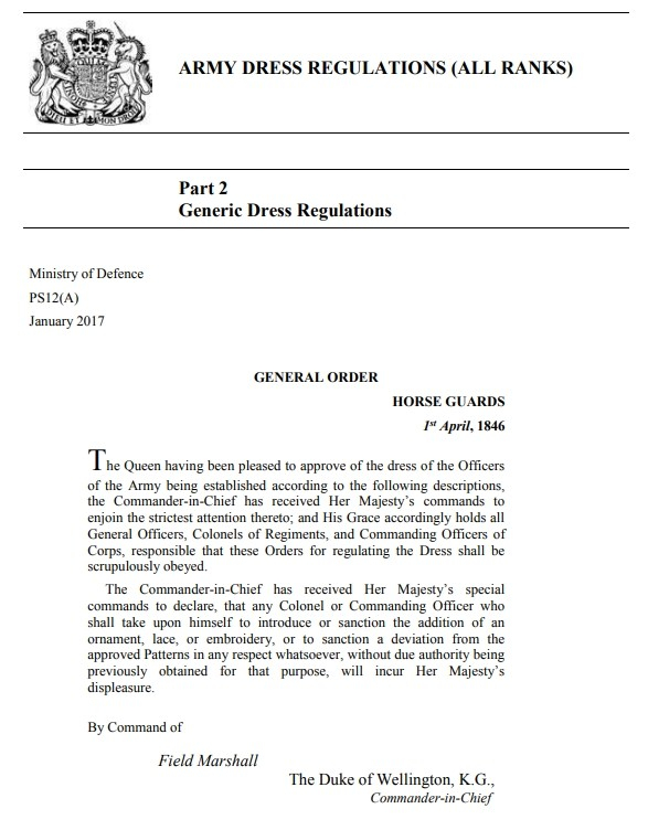 Главнокомандующий получил особое распоряжение Ее Величества, гласящее, что любой полковник или командующий офицер, который возьмет на себя смелость ввести или санкционировать добавление украшения, кружева или вышивки, или санкционировать отклонение от утвержденных образцов в любом отношении без предварительного получения надлежащего разрешения на эту цель, навлечет на себя недовольство Ее Величества.