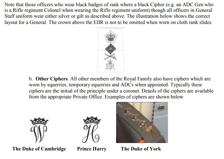 Примечание: те офицеры, которые носят черные знаки различия (например, ADC Gen, который является полковником стрелкового полка, когда носит униформу стрелкового полка), носят черный вензель, хотя все офицеры в униформе Генерального штаба (General Staff uniform) носят либо серебряный, либо позолоченный, как описано выше. Иллюстрация ниже показывает правильное расположение для генерала. Корона над EIIR не должна опускаться при ношении на матерчатых погонных нашивках (cloth rank slides).