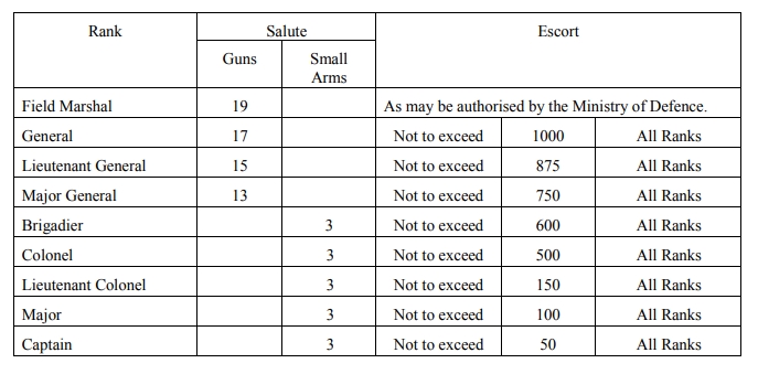 - d. Эскорт и почетный залп или орудийный салют (Escort and Firing Party or Gun Salute). Военные похороны должны сопровождаться отданием почестей, и может быть предоставлен эскорт. Количество войск, присутствующих на церемонии, определяется местными военными властями. Залпы из орудий или стрелкового оружия производятся после того, как тело предано земле. На похоронах в Лондоне генералов, имеющих право на орудийный салют, салют, если не приказано иное, производится с территории Королевского госпиталя в Челси (Royal Hospital, Chelsea). Если салют производится у крематория, то он должен прозвучать, когда гроб вносят в часовню. По возможности, если умерший был военным офицером, эскорт должен соответствовать численности, указанной в приведенной ниже таблице.