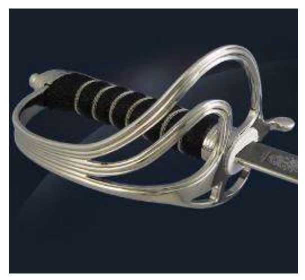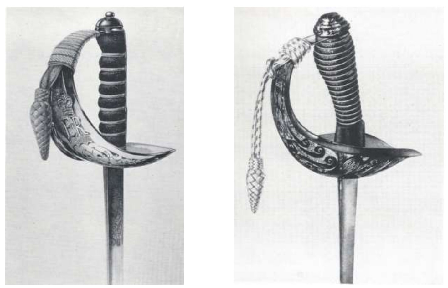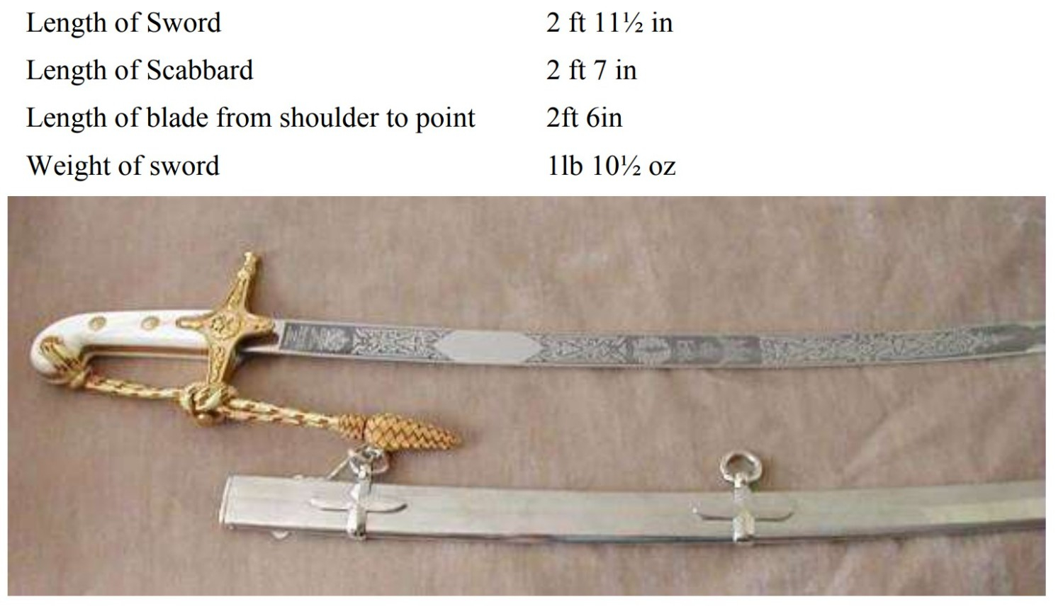 3. Образец Королевской артиллерии (Royal Artillery Pattern): Клинок слегка изогнут, плавно сужается и имеет долы (fullered) с обеих сторон, начинающиеся на расстоянии 1,5 дюйма от эфеса (hilt) и доходящие примерно до 9 дюймов от острия. Гарда (guard) выполнена из штампованной мягкой стали по трехпрутковому образцу (3 bar pattern). Рукоять (grip) деревянная, обтянута кожей ската (fish skin) и обмотана серебряной проволокой. Длина рукояти должна быть от 5 до 5¾ дюймов. Клинок может быть гладким или с орнаментальным тиснением. В последнем случае, хотя и не требуется соблюдения единого образца орнаментации, в дизайне не должны присутствовать какие-либо знаки или эмблемы, за исключением Королевского вензеля (Royal Cypher) и Короны или полкового знака (regimental badge) вместе с обычными названием производителя и торговой маркой. Размеры следующие: