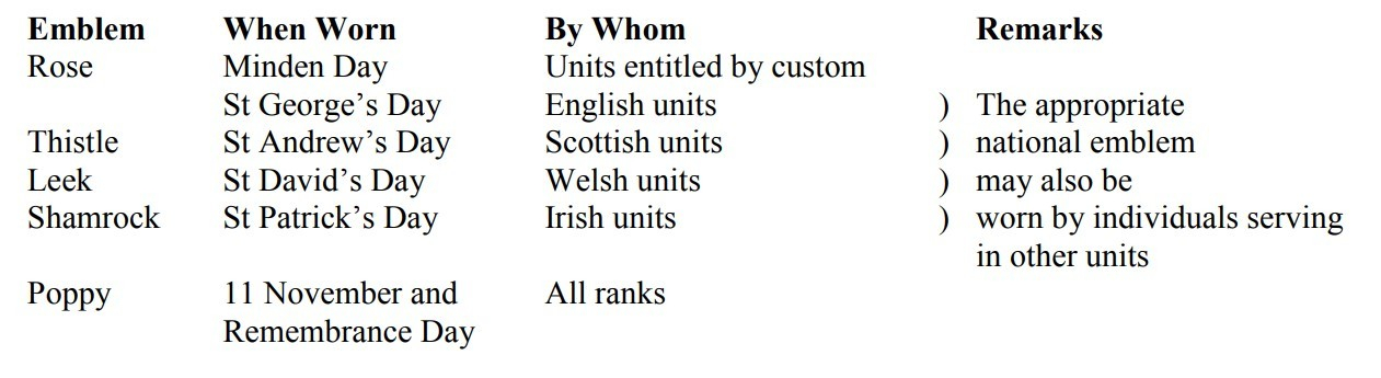 02.33. Введение. К военным знакам (badges) относятся общеармейские знаки различия (знаки различия по званию, по должности и квалификационные), а также полковые/корпусные знаки. Последние, которые детально описаны в Части 9 настоящих правил, включают кокарды (cap badges), нагрудные знаки (collar badges), нашивки на плечи (shoulder-titles) и изображения на снаряжении (accoutrements). Они также включают нарукавные знаки (arm-badges), носимые уоррент-офицерами и старшими унтер-офицерами (WOs/SNCOs) некоторых подразделений вместе со знаками различия по званию, а также любые особые отличия, предоставленные отдельным полкам. Не разрешается носить на форме никакие знаки, кроме разрешенных настоящими правилами.