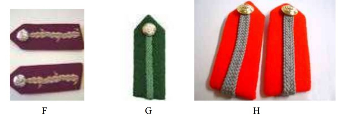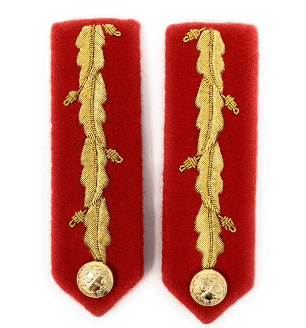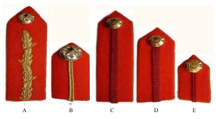 Фельдмаршалы и Генералы | Алое сукно, длина 4½ дюйма, ширина 1¼ дюйма, треугольные на конце, показывающие ½ дюйма воротника выше и ниже патча (patch). Центр пуговицы на расстоянии ¾ дюйма от острия. Линия золотой вышивки дубовым листом (gold oakleaf embroidery) по центру с 2 желудями (acorns) сверху и 2 снизу. | Как для формы №1, но длиной 3½ дюйма. 2 желудя на внешней стороне и 1 на внутренней. Низ патча должен быть заподлицо над уступом лацкана (step of the lapel), а внешний край патча на расстоянии ¼ дюйма от края лацкана. | Алое сукно, длина 2 дюйма, ширина 1 дюйм. Центр пуговицы на расстоянии ½ дюйма от острия. Простой золотой галун (plain gold braid) шириной 1/8 дюйма по центру. Носится на воротнике рубашки. |