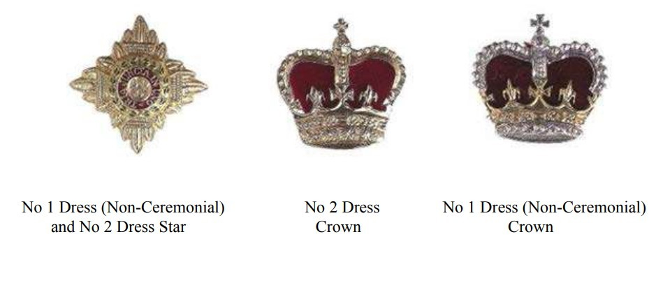 04.123. Звезды и короны, носимые лицами Генерального штаба, должны быть дизайна «Звезда Ордена Бани» (Bath Star) и «Корона Святого Эдуарда» (St Edward’s crown). Металлические знаки должны быть большого размера, диаметром ¾ дюйма. Однако бригадиры должны носить «Звезду Бани» диаметром 5/8 дюйма, чтобы две звезды можно было носить рядом. Вышитые знаки различия званий должны быть тех же размеров, однако на парадной вечерней форме (Mess Dress) знаки различия званий должны быть уменьшенного размера (½ размера).