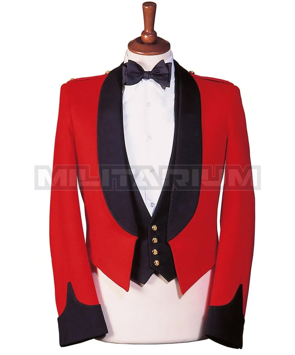 04.43. Мундир (Tunic). Из алого сукна, с синим воротником и обшлагами. Воротник окантован по всему периметру золотым галуном шириной 5/8 дюйма. Обшлага круглые, глубиной 3 дюйма, с двумя полосами золотого галуна шириной 5/8 дюйма вокруг верхнего края, между полосами видна полоска синего сукна шириной 1/8 дюйма. На каждом рукаве — алый трехугольный клапан (flap) глубиной 6 дюймов и шириной 2½ дюйма в точках, окантованный золотым галуном шириной 5/8 дюйма; на каждом клапане по три средние пуговицы. Алый клапан, также окантованный галуном, на каждой фалде сзади, начинающийся ниже талевых пуговиц и образующий два угла, верхний шириной 1½ дюйма, нижний — 2¼ дюйма, на полдюйма выше низа фалд. Пуговица на каждом углу клапана. Ряд галуна шириной 5/8 дюйма, окантованный белым кантом, от центра талии до низа фалды; 8 пуговиц спереди и 2 на талии сзади. Перед, воротник, обшлага и клапаны окантованы белым сукном шириной в три шестнадцатых дюйма. Горжетные планки не носятся.