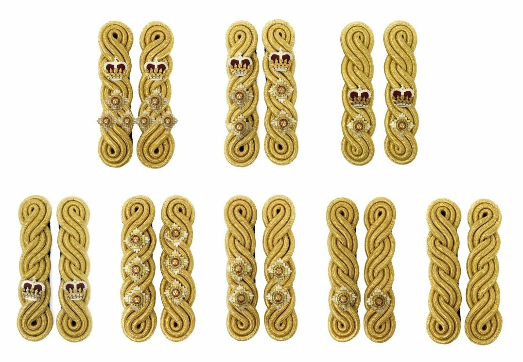 04.431. Погонные жгуты. Плетеные золотые погонные жгуты (twisted gold shouldercords) общевойскового образца, подбитые синим сукном. Знаки различия по званию стандартного размера из серебряного золоченого металла (silver gilt metal).