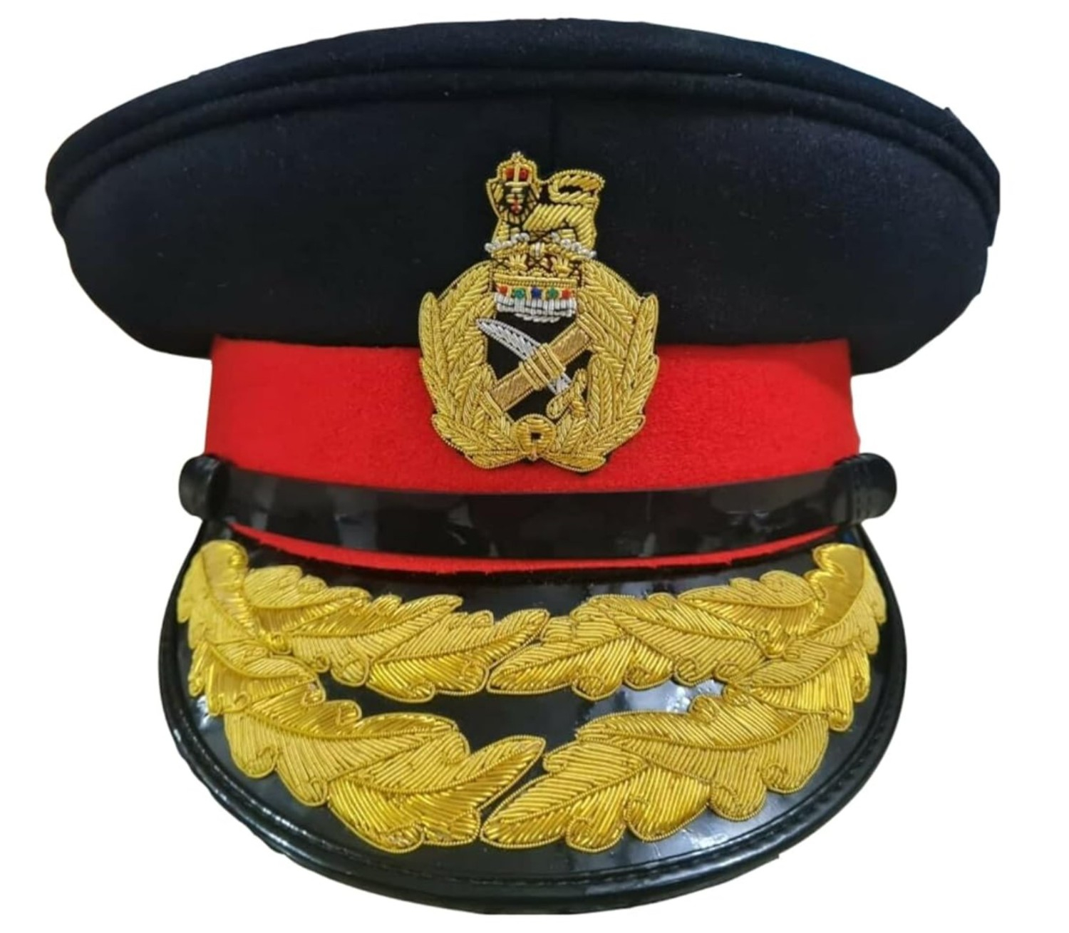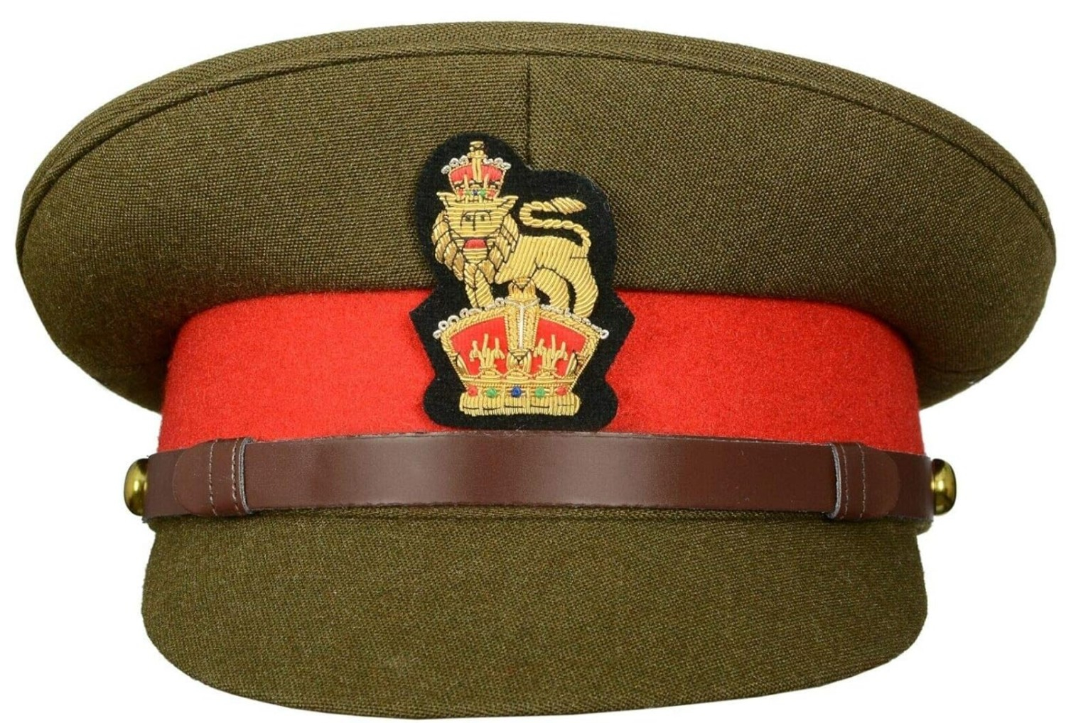04.417. Головной убор. Синяя фуражка с козырьком, с кантованным околышем (алого или других цветов, как указано для RAMC, RADC и RAChD) с вышитой золотом на синем сукне кокардой в виде Королевского герба, с синей кантовкой на шве тульи. Козырек вышит одним рядом золотых дубовых листьев по внешнему краю. Пуговицы подбородочного ремешка штабного образца.
