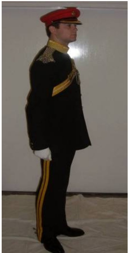 10 | Мундир / Рейтузы (Tunic / Overalls) | Офицеры/Уоррент-офицеры 1-го класса (Officers/WO1): Мундир (Tunic): Синий баратея (Blue Barathea), полный желто-коричневый воротник (full buff collar), погоны из кольчуги в форме наконечника стрелы (arrowhead chain mail epaulettes), полусферические пуговицы (half ball buttons), позолоченные (просто золотые) знаки различия (gilt (plain gold) badges of rank). Рейтузы (Overalls): Синий баратея с двумя кавалерийскими желтыми лампасами (Cavalry yellow stripes) шириной 3/4 дюйма, на расстоянии 1/8 дюйма друг от друга. Рядовой состав (OR’s): Мундир (Tunic): Синий баратея, полный желто-коричневый воротник, квадратные погоны из кольчуги (square chain mail epaulettes), полусферические пуговицы. Брюки (Trousers): Синий баратея с двумя кавалерийскими желтыми лампасами шириной 3/4 дюйма, на расстоянии 1/8 дюйма друг от друга. |