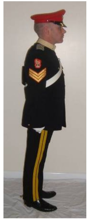 Старшие сержанты (SNCO) | Нагрудный знак (Collar badge) - вышитый тканевый (embroidered cloth type). Миниатюрные медали с креплением "вполнагрудия" носятся на левой стороне груди. Ботинки «Джордж» (George boots) со шпорами «лебединая шея». |
