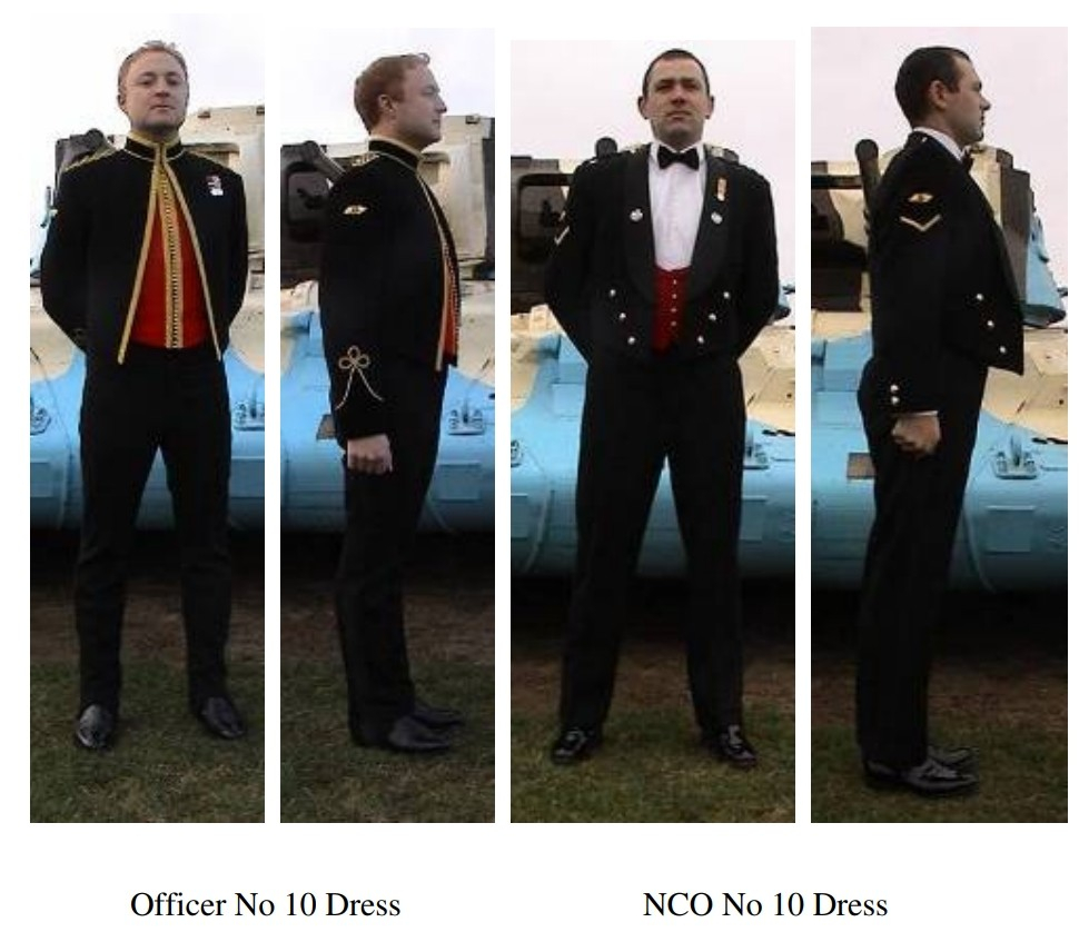 Как указано выше (As Above) | Куртка (Jacket): Из черного суперфина (black superfine) со стоячим воротником (stand collar). Ряд золотого галуна с узором "роза" (gold rose lace) шириной 5/8 дюйма спереди. Подбита алым (Lined in scarlet). Воротник из черного бархата (black velvet) с рядом золотого галуна "роза" шириной 5/8 дюйма спереди и поперек верха и рядом золотого галуна "Россия" (gold Russia) шириной 5/32 дюйма вокруг основания. Обшлага из черного бархата, заостренные (pointed), с одним рядом золотого галуна "Россия" шириной 5/32 дюйма вокруг верха, образующим узор "гусиная лапка" (crow’s foot) на острие. Черно-золотые погоны (Black and gold shoulder cords) с вышитыми серебряными знаками различия (5/8” silver embroidered badges of rank), закрепленные вверху полковой пуговицей. Нагрудные знаки (collar badges) не носятся. Особый нарукавный знак с изображением танка носится в 4 дюймах ниже плечевого шва на правом рукаве. Жилет (Vest): Из алого суперфина (scarlet superfine), с высоким вырезом (cut up to neck), с одним рядом декоративных пуговиц (teat studs) спереди и рядом золотого галуна "роза" шириной 5/8 дюйма с каждой стороны. 2 втачных кармана (jetted pockets). Кремовая подкладка (Cream lining). Застежка-молния с правой стороны и вверху по центру спины. Рейтузы (Overalls): Из темно-синей ткани (dark blue cloth) с 2-дюймовой черной полосой из мохерового галуна (black mohair braid stripe). Рубашка (Shirt): Простая белая (Plain white) с отложным воротником (turn down collar) с черным галстуком-бабочкой с квадратными концами (black square ended bow tie). Обувь: Ботфорты (Mess Wellington boots). Шпоры для адъютантов (Adjutants) и офицеров полевого состава (Field Officers). Головной убор: Берет (Beret) |