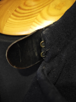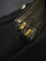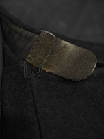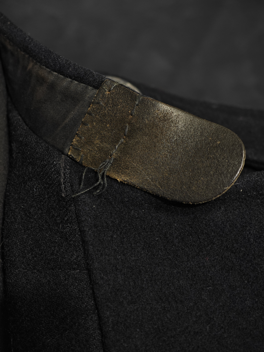 Кожаный хлястик на горле, с латунными крючками.
