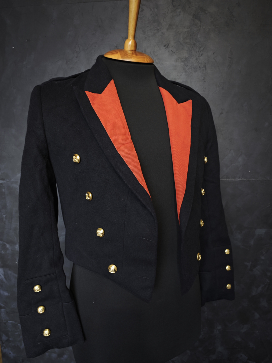 Это классический фасон Mess Dress — парадного вечернего обмундирования для офицеров. Оно предназначено для официальных ужинов, приемов и других торжественных мероприятий в закрытых помещениях (в "месси", то есть офицерском собрании). Китель не застегивается, так как его носят расстегнутым.