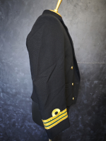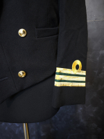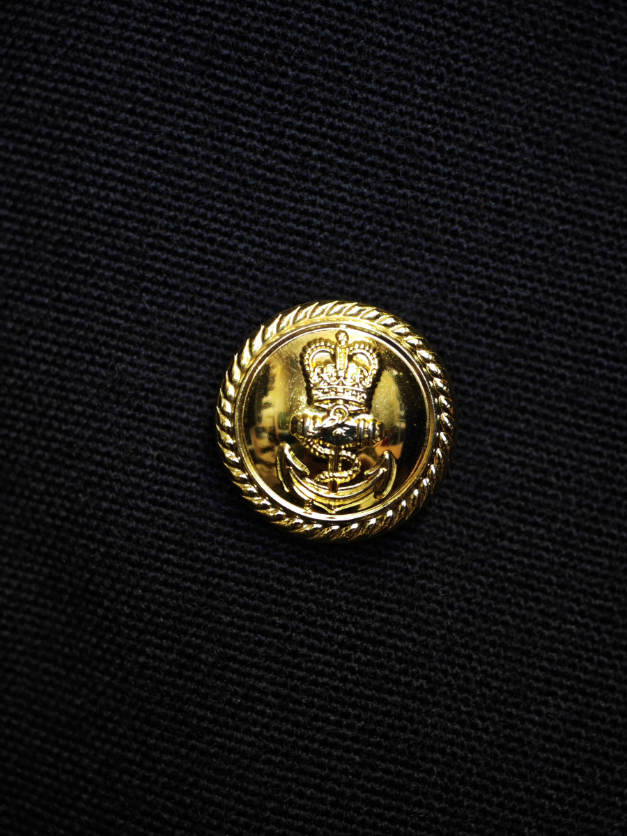 Его дизайн и детали указывают на высокий ранг и особые обстоятельства ношения. Пуговицы с якорем и короной Елизаветы II Это стандартные позолоченные пуговицы офицера Королевского флота. Коронка конкретного монарха (здесь Елизаветы II) позволяет датировать китель периодом после 1952 года. Правление Елизаветы II (после 1952 года), вероятно, 1960-е - 1980-е гг.