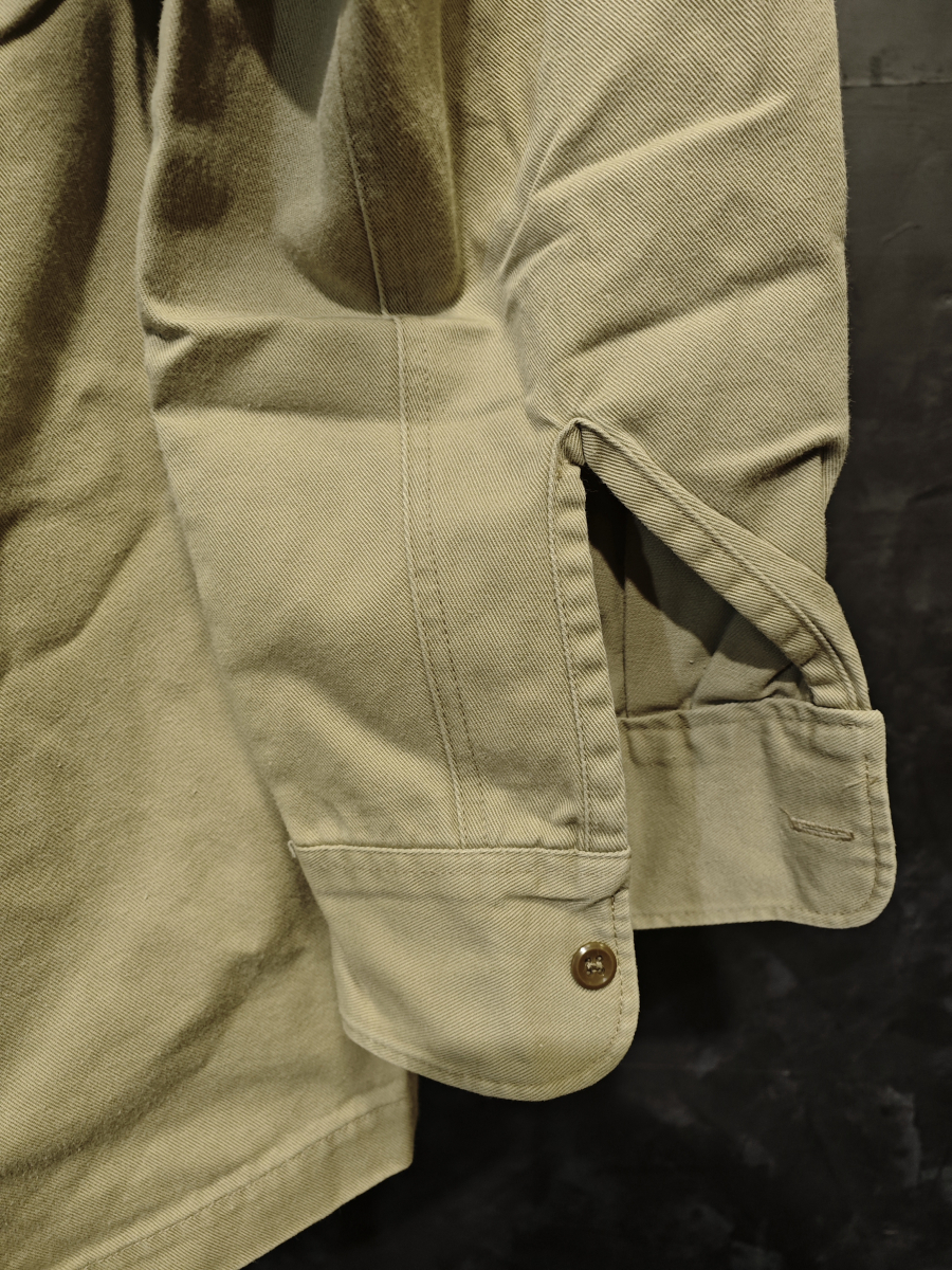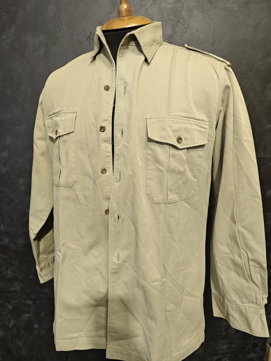 Сухопутные войска (KLM) носили оливковый (зеленоватый) цвет, а авиация — вот этот специфический нейтральный бежевый/песочный оттенок, часто называемый «stone» или «sand». Ткань «плотная саржа»: Классическая ткань для такой рабочей/служебной рубашки — смесовая саржа (twill). Она прочная, хорошо держит форму, устойчива к износу и относительно немаркая.