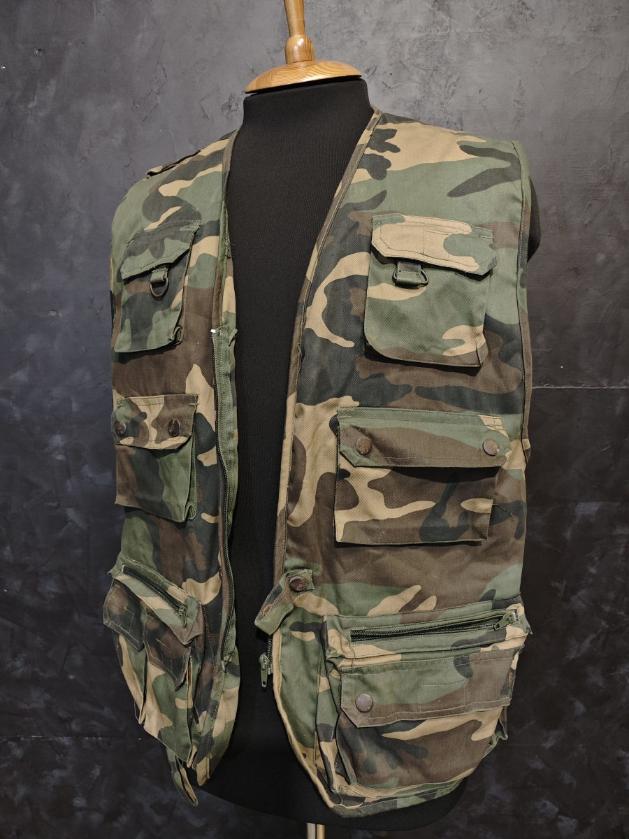 Жилет в лесном камуфляже вудланд для активного отдыха на природе, охоты и рыбалки.