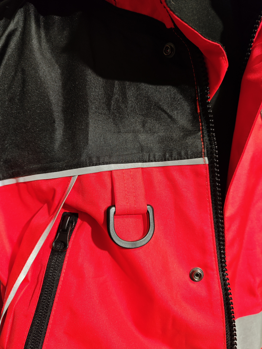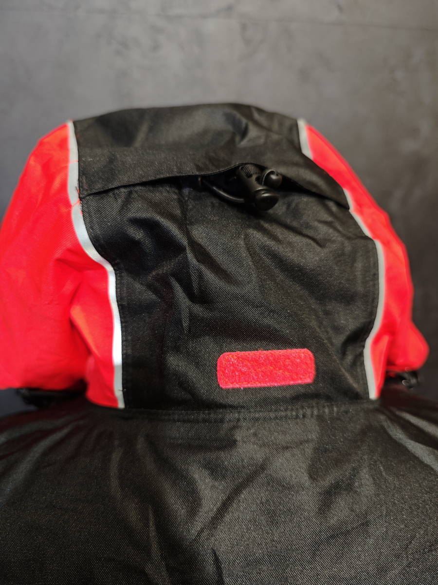Высокий воротник в который укладывается капюшон (также из мембраны) и закрывается на липучку.