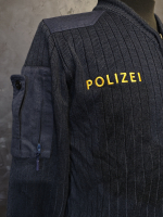 Главный опознавательный знак: Непосредственно на ткань свитера спереди, обычно на левой стороне груди, интегрирована или нанесена методом вышивки/печати надпись "POLIZEI".